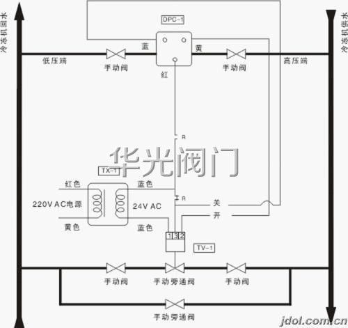 壓差控制器DPC-1通過檢測供/回水主管的壓力差,與設定值相比較,通過控制電動兩通閥的開度,使供水與回水間實現旁通,以保持所需的壓力差值。