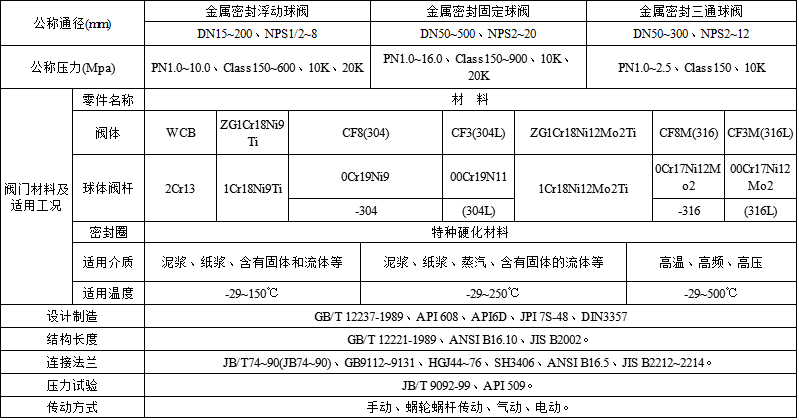 金屬硬密封球閥适用於Class150~1500、PN1.6~16.0MPa,工作溫度-29~425℃(碳鋼)或-40~550℃(不鏽鋼)的各種管路上,用於截斷或接通管路中的介質,選用不同的材質,可分别适用於水、蒸汽、油品、硝酸、醋酸、氧化性介質、尿素、氨鹽水、中和水等多種介質。
