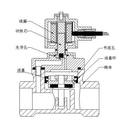 活塞式電磁閥工作原理:線圈通電後由於吸力作用,動鐵芯下移,把副閥閥塞壓下,副閥關閉,主閥閥杯内壓力上升,當壓力升到一定值時,主閥閥杯的上下壓差一樣,由於電磁力作用,動鐵芯失去主閥閥杯下,壓緊主閥閥座,閥門關閉。線圈斷電時,電磁吸力爲零,副閥閥塞和支鐵芯由於彈簧作用向上提起,副閥打開,主閥閥杯的流體經副閥流走,減少作用在主閥閥杯上的壓力,當主閥閥杯上的壓力減少到一定值時,利用壓差把主閥閥杯推起,主閥打開,介質流通。