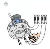 2、四對螺栓和螺母輕輕插入法蘭孔,擰緊螺母一點校正凸緣表面的平坦度;