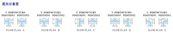 氣動三通球閥不同於其他氣動二通球閥,它分T型和L型兩種流向,以下爲它的流向示意圖: