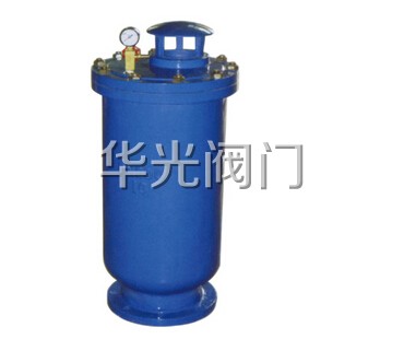 複合式排氣閥爲圓桶式閥體,其内部主要有不鏽鋼浮球及塞頭。本閥裝設於泵浦出水口處或送配水管線中,用以大量排出管道中的集結之空氣,以增進水管及抽水機使用效率,管内一旦出現負壓時,此閥能迅速吸入空氣,以確保管線不會因負壓而被損壞,壓力等級1.0MPa。